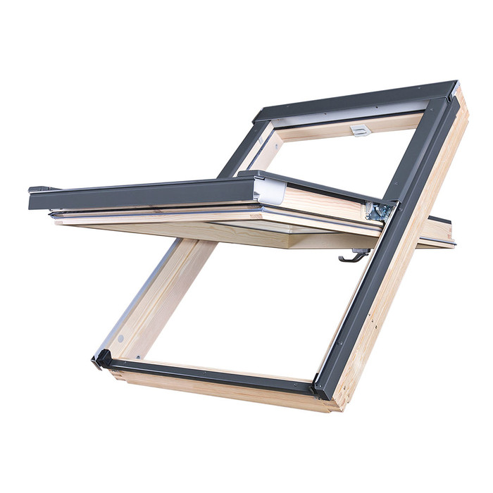 Мансардное окно со среднеповоротным открыванием FAKRO — самая популярная конструкция окна для крыши. Благодаря фрикционным петлям, располагающимся в ее центральной части, створку можно оставлять в позиции наклона, а также поворачивать вокруг оси на 180°, что значительно облегчает мытье внешнего стекла.